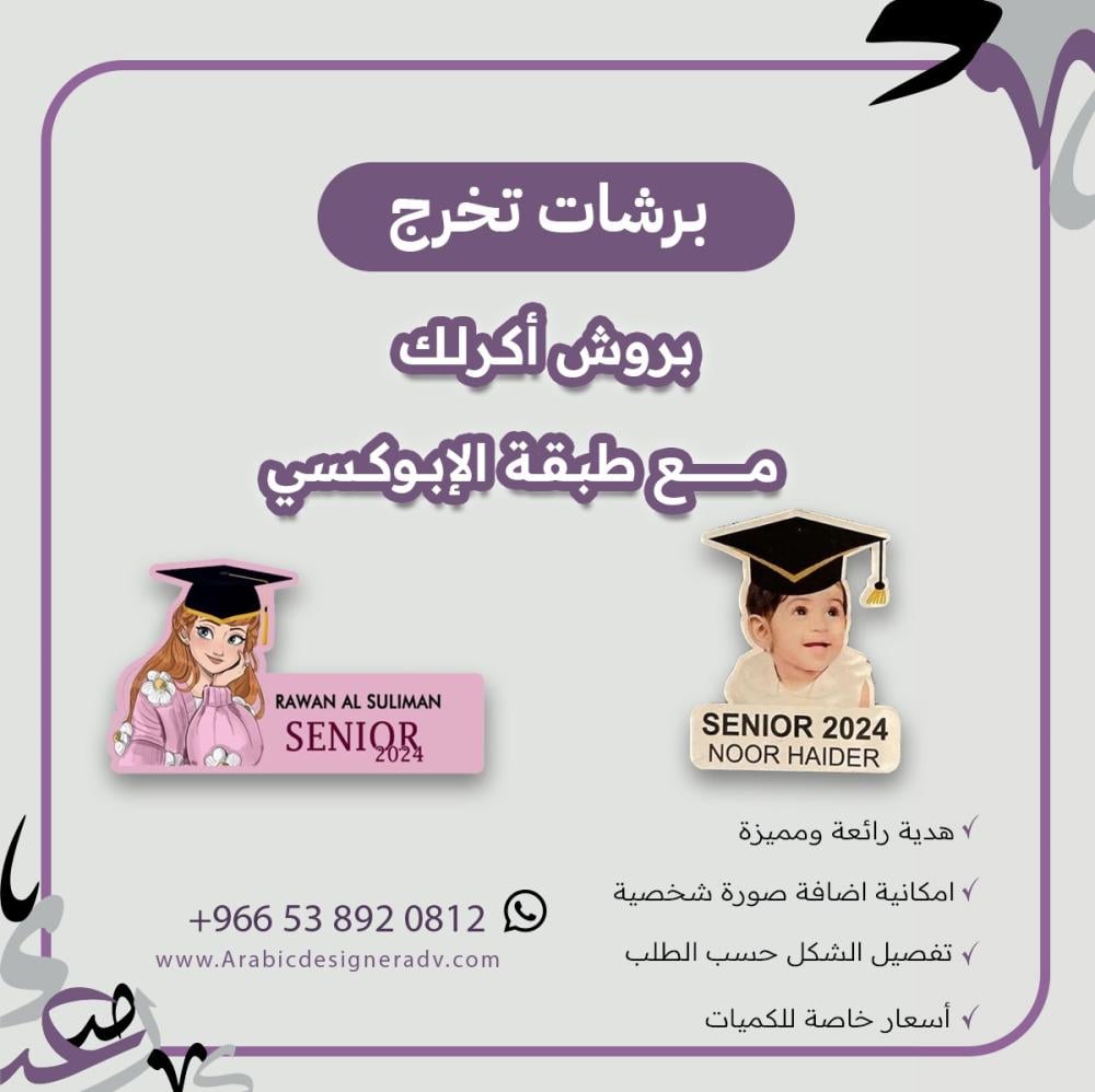 دبابيس تخرج من الاكرلك مع طبقة ابوكسي بطباعة ( الاسم + التاريخ + الصورة ) + مثبت بالخلف ( مشبك أو مغناطيس ) كلاهما متوفر